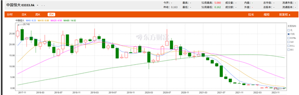 巅峰时期,2017年中国恒大市值一度约4000亿港元,2021年,中国恒大流动性问题彻底爆发,股价一路走低,从14港元/股持续下跌。