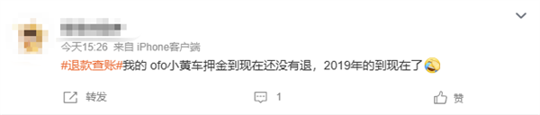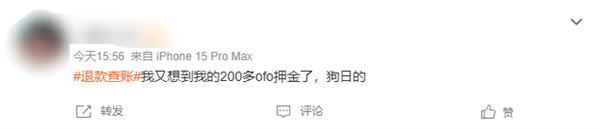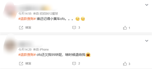值得一提的是,在“退款查账”词条下,还有很多网友表示:“我的ofo小黄车押金到现在还没有退,2019年的到现在了。”“ofo还欠我99块呢,啥时候退给我。”“我又想到我的200多ofo押金了。”