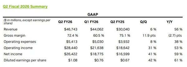 公司第二季营收增长56%至467.43亿美元,净收益增长59%至264.22亿美元,摊薄后每股收益1.08美元,较去年同期大幅增长。这家全球市值最高的公司代表了蓬勃增长的人工智能投资热潮,人们现在担心AI领域乃至整个IT市场是否存在投资过热。