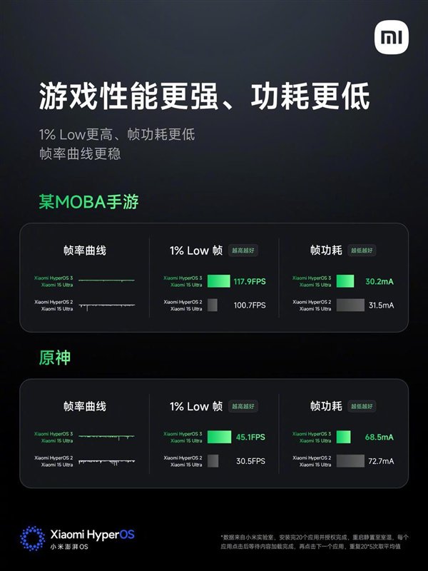 经实测,在游戏《原神》场景,搭载澎湃OS 3的小米15 Ultra帧率曲线比澎湃OS 2更稳,同时也超过了友商的表现。