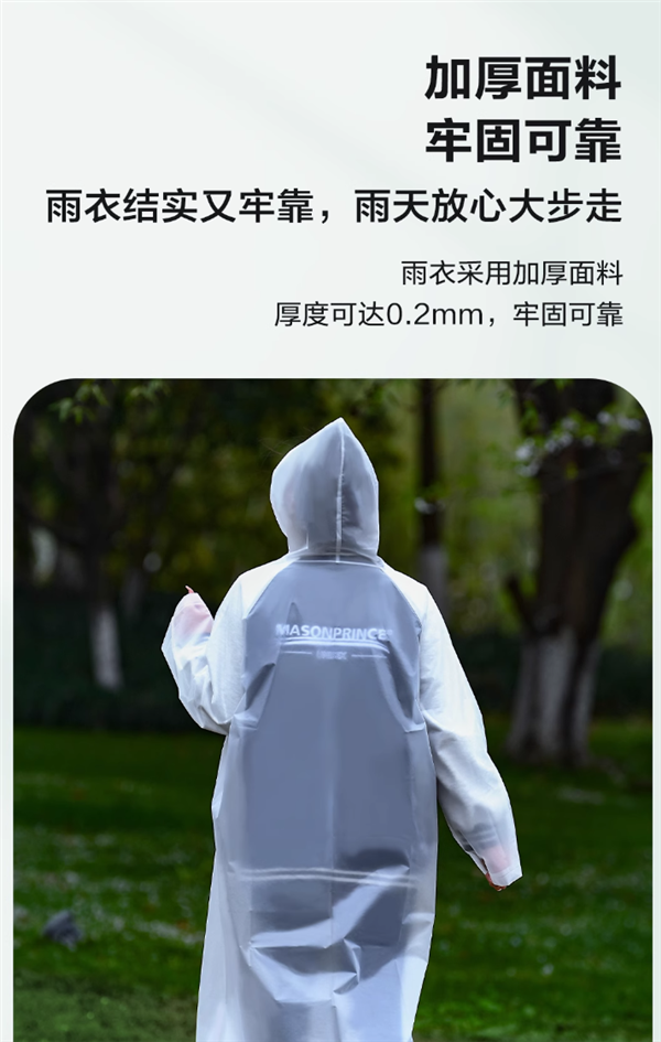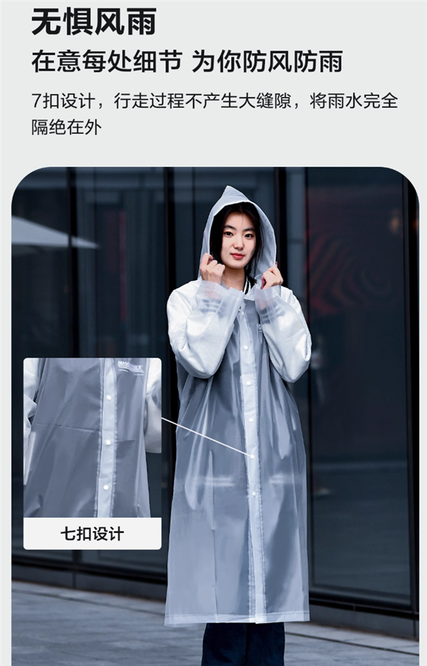 EVA 材质,连帽抽绳,多扣设计,防雨渗入,轻盈柔软。穿戴舒适,无惧刮风下雨,一穿即走。