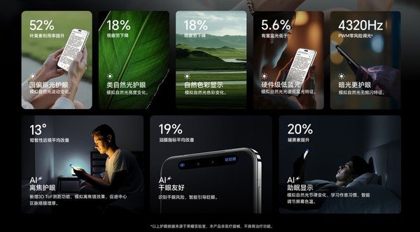 就拿旗舰产品荣耀Magic7系列来说,具备八大护眼功能,硬件级低蓝光有害蓝光低于5.6%这已经是最基础的了。其他还包括了4320Hz PWM零风险调光来模拟自然光无频闪;自然色彩显示模拟自然光色彩变化,视疲劳降低18%;类自然光护眼模拟自然光色彩变化,视疲劳下降18%;圆偏振光护眼,模拟自然光波动变化,叶黄素利用率提升52%;AI离焦护眼模拟离焦镜效果,促进中心区脉络膜增厚,短暂性近视平均改善13°;AI干眼友好识别干眼风险,智能引导眨眼,泪膜指标平均改善19%;AI助眠显示,模拟自然光节律变化,学习作息习惯,智能调节屏幕色温,褪黑素提升20%等。