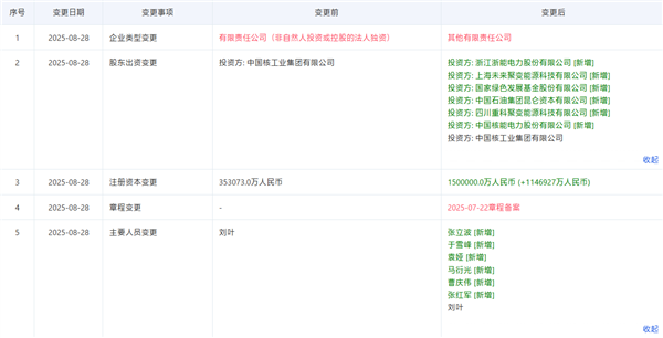 除了董事长等人员变更之外,中国聚变能源有限公司还新增中国石油集团昆仑资本有限公司、中国核电、浙能电力等为股东,注册资本由约35.31亿人民币增至150亿人民币,增幅约325%。