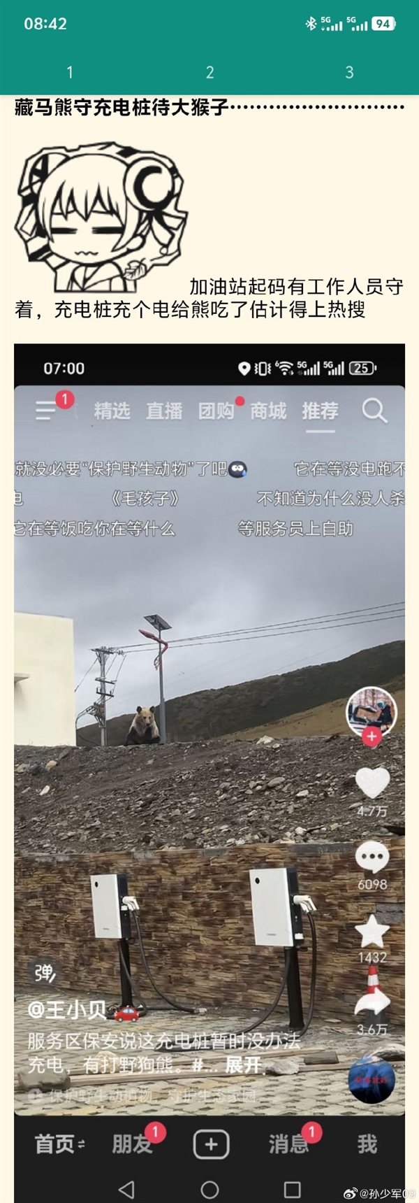 有网友戏称:“藏马熊守充电桩待大猴子”,加油站起码有工作人员守着,而充电桩充个电给熊吃了估计得上热搜。