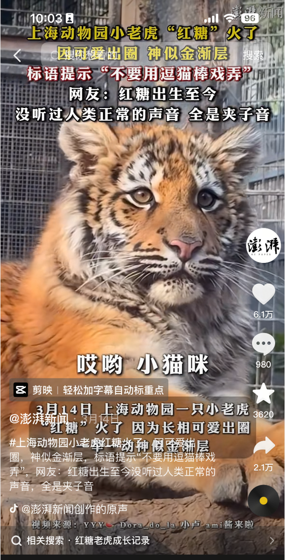 据了解,“红糖”是上海动物园人工育幼的雌性孟加拉虎,2024年8月10日出生,遭母虎弃养,因装在印有“红糖麻花”字样的育幼纸箱而得名。