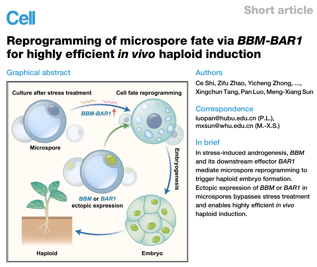 20世纪60年代以来,育种学家致力于利用胁迫处理(如高温、营养饥饿等)诱导植物小孢子(未成熟花粉)转变发育命运,从配子体途径重编程为胚胎发生通路,从而获得单倍体植株。该策略可显著加快作物自交系制备和品种改良进程,已应用于油菜、烟草、小麦等作物。