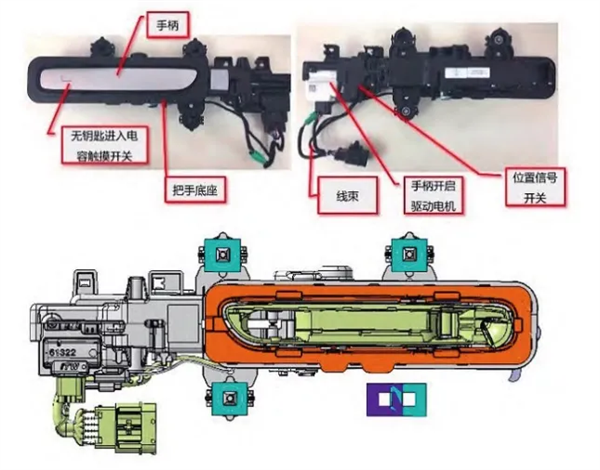 但这种平推式,并没有物理的弹出方式,完全是靠电机才能把门把手推出来。像是下图这种,它是在传统门把手基础上,增加了手柄开启驱动电机,以及 2 个电容的位置信号开关。