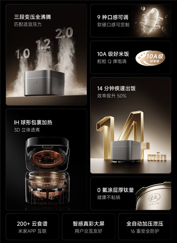 经检测,相较于米家前代电饭煲,该产品煮出的米饭香气浓度提升52%、天然甜味提升58%、蓬松度提升22%,达到《电饭煲烹饪米饭品质评价方法》10项A级标准(蓬松度、平整度、含水率、香气等)。