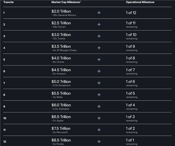 你可以把它想象成一场马斯克为自己量身定制的、难度堪称「地狱级」的闯关游戏。整个计划要在十年内完成,被分成了12个大关卡。每闯过一关,他才能解锁一部分股权奖励。