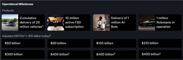 除了上述四大支柱,这个计划还绑定了一系列持续增长的EBITDA(税息折旧及摊销前利润)目标,从500亿美元起步,直至惊人的4000亿美元。这确保了特斯拉在追求规模扩张的同时,必须保持强大的盈利能力和健康的现金流