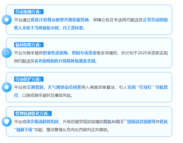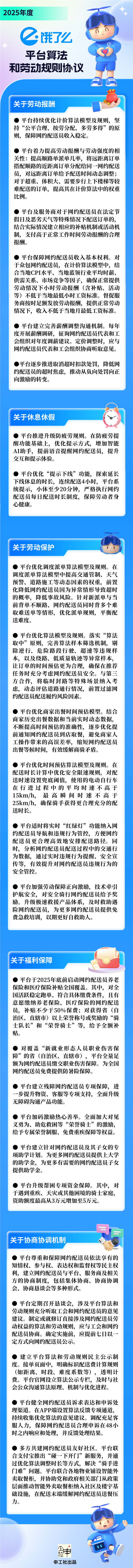 值得一提的是,在今年4月,全国首份平台算法和劳动规则协议《2025年度“饿了么”(上海)网约配送算法和劳动规则协议》在上海诞生,其中包含多项保障骑手切身利益的条款。