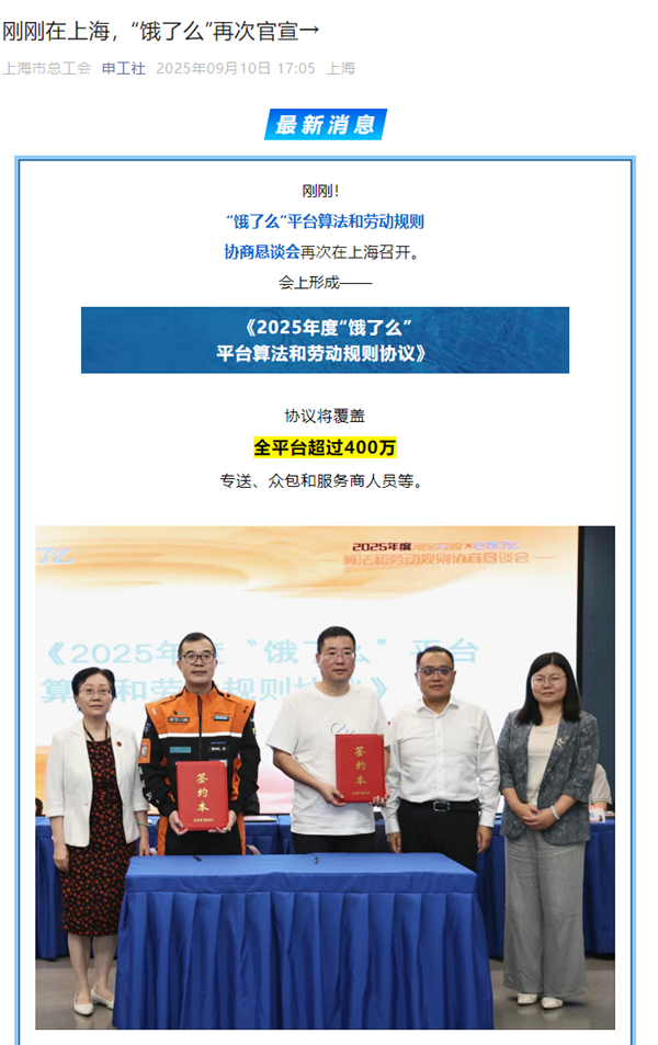快科技9月10日消息,今日,据上海市总工会官方发布,“饿了么”平台算法和劳动规则协商恳谈会再次在上海召开,会上形成了《2025年度“饿了么”平台算法和劳动规则协议》。