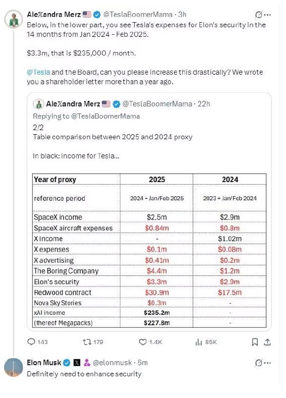 该网友公开呼吁:“特斯拉还有董事会吗?你们能不能大幅提高这笔预算?”马斯克本人在回应中表态:“绝对需要加强安全。”