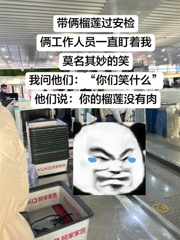 有网友分享,自己带着两颗榴莲过安检时,两名工作人员一直莫名发笑。疑惑之下询问原因,得到的答案让人哭笑不得 ——“你的榴莲没有肉”。