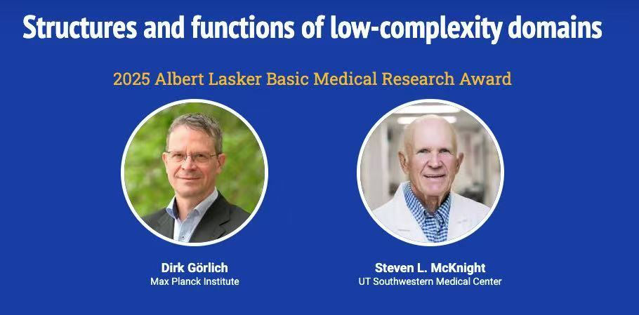 2025年拉斯克基础医学研究奖授予了德国马克斯·普朗克研究所的德克·戈尔利希博士以及美国得克萨斯大学西南医学中心的史蒂文·麦克奈特博士,以表彰他们在揭示细胞内蛋白质运输与细胞组织构成新机制方面的开创性贡献。他们的研究聚焦于蛋白质序列中的低复杂度结构域(LCDs),这类结构域由少数种类氨基酸构成,曾被认为难以承担重要生物学功能。然而,真核生物中约15%至20%的蛋白质含有此类序列。戈尔利希与麦克奈特的研究揭示,这些“无序”结构域能在细胞内形成高度有序的组装体,参与调控物质运输与细胞功能组织,为理解细胞内部复杂运作提供了全新视角。