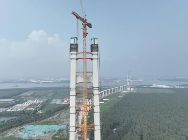此前9月7日,北主塔已经抢先一步成功攀升至300米的新高度。建成后两座主塔高将达350米。不同的是,南主塔是大桥唯一一座江中主塔。