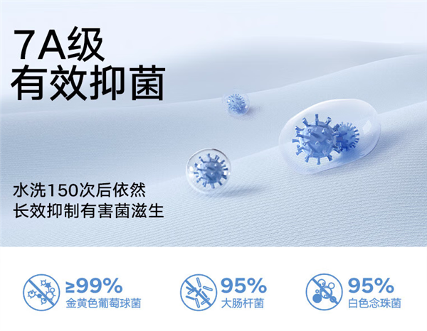 7A级有效抑菌,水洗150次后依然长效抑制有害菌滋生。