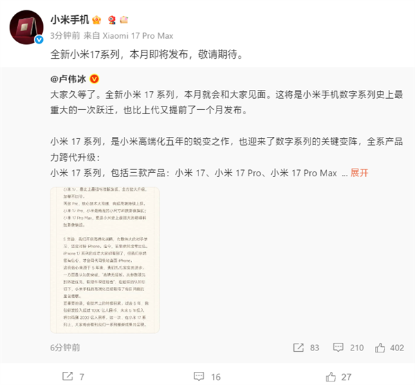 快科技9月15日消息,卢伟冰发文正式官宣,小米17系列本月发布,将是小米手机数字系列史上最重大的一次跃迁。