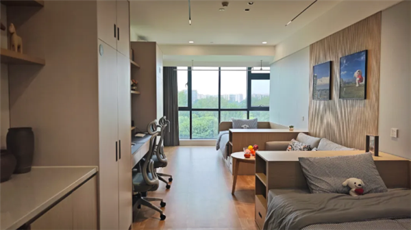 公寓里人脸识别闸机入楼、固定楼层电梯梯控、智能密码锁进门。房间内部,从工作、学习所需的人体工学椅、书桌,到起居所需的干湿分离的卫生间、洗衣机,家电家具一应俱全。
