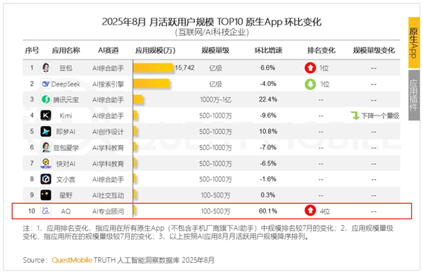 不难看出,前两大赛道规模仍遥遥领先,但AI专业顾问这一赛道正表现出巨大发展潜力:原生App环比增速达56.5%,远超第一、二大领域,AQ也闪电入围了全行业榜单的前10。