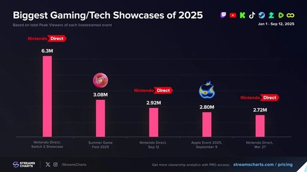 根据StreamCharts的数据,9月12日的任天堂直面会峰值观众数达292万,超过了三天前苹果iPhone 17发布会的最高同时观看人数280万。