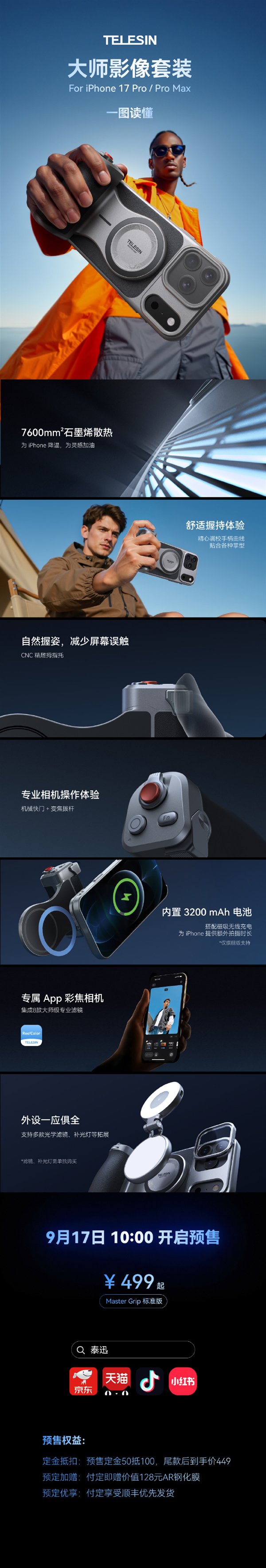 快科技9月17日消息,今日,国产配件厂商泰迅数码正式发布为iPhone 17 Pro系列打造的大师影像套装,官方宣称“让iPhone从手机到相机”。