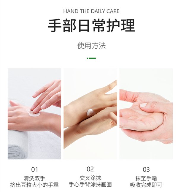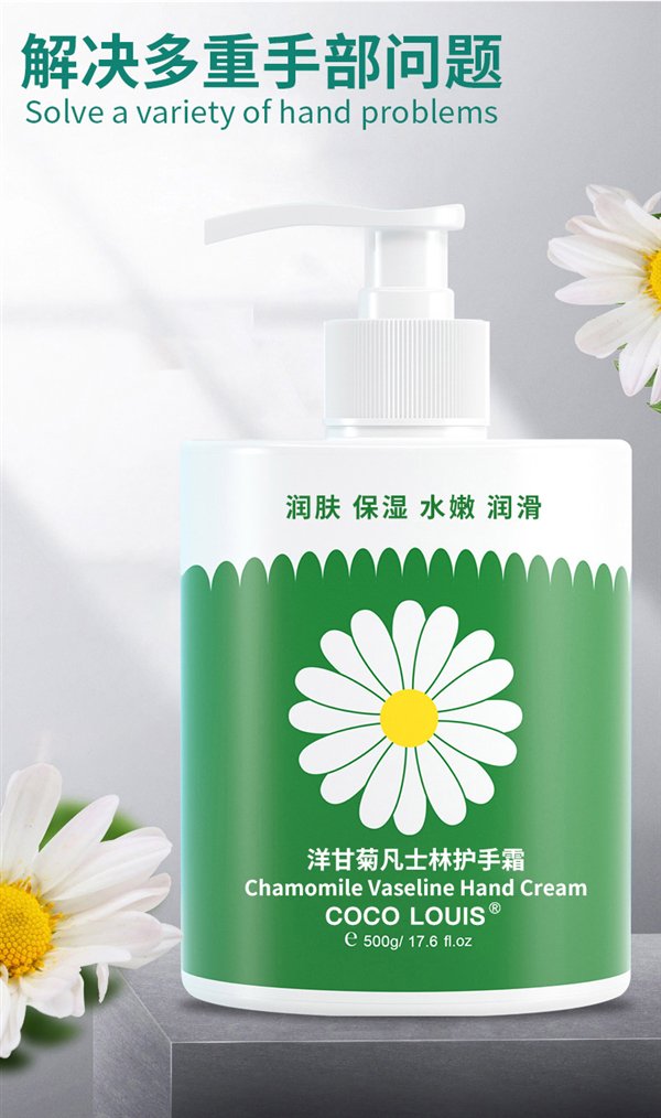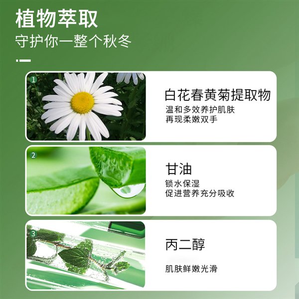 护手霜具备润肤、保湿、水嫩、润滑四大核心功效,且有小甘菊清香,好用好闻。