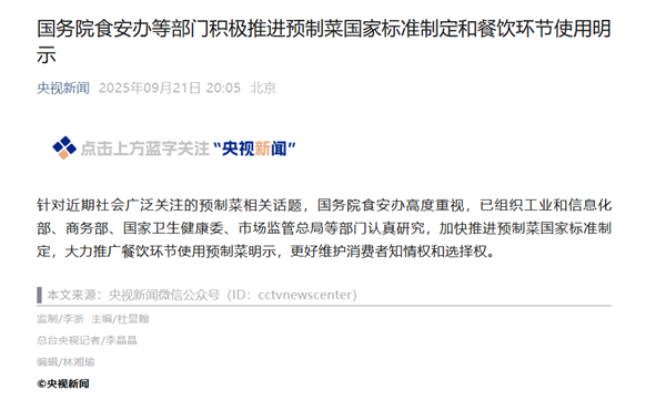 值得一提的是,据央视报道,针对近期社会广泛关注的预制菜相关话题,国务院食安办高度重视,已组织工业和信息化部、商务部、国家卫生健康委、市场监管总局等部门认真研究,加快推进预制菜国家标准制定,大力推广餐饮环节使用预制菜明示,更好维护消费者知情权和选择权。