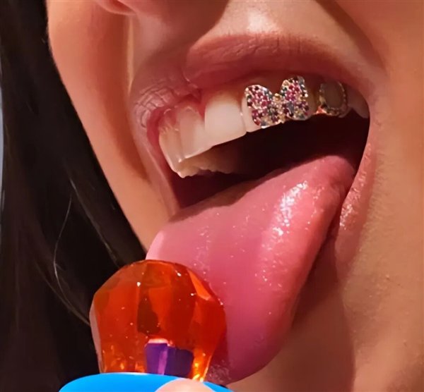 除了这些,国外流行的还有“水晶牙”,就是将水晶、珠宝等物品当作饰品,点缀在牙齿表面(黏上去的,容易被误吞),还有价值不菲的“珠宝牙套”。
