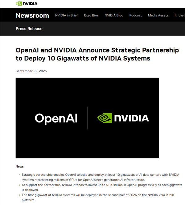 快科技9月23日消息,据英伟达官网,日前,英伟达与OpenAI宣布达成合作,英伟达有意将逐步向OpenAI投资至多1000亿美元,用于支持数据中心及相关基础设施建设。