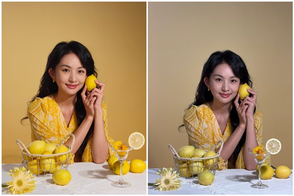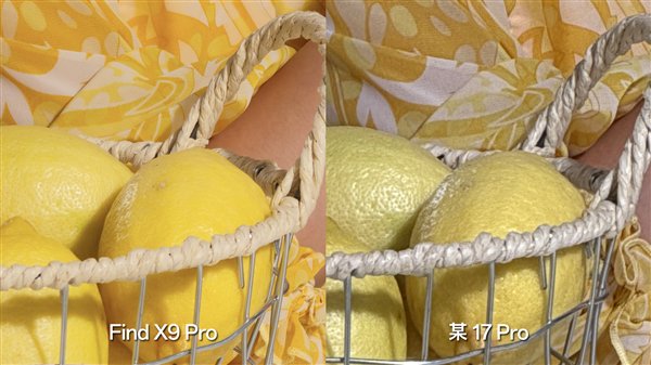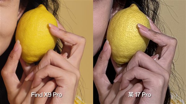 在这组对比图中,无论是人物的肤色,还是耳朵上的坠饰,再到桌面上的柠檬和花瓣,OPPO Find X9 Pro色彩还原的效果一目了然,比iPhone 17 Pro拍摄的样张更胜一筹。