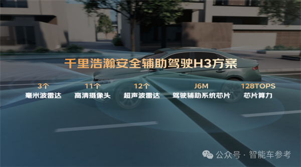 硬件配备11个高清摄像头+3个毫米波雷达+12个超声波雷达,搭载地平线J6M芯片,算力超128TOPS。