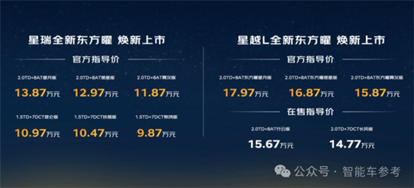 星瑞全新东方曜价格为9.87~13.87万元,星越L全新东方曜价格为15.87~17.97万元。