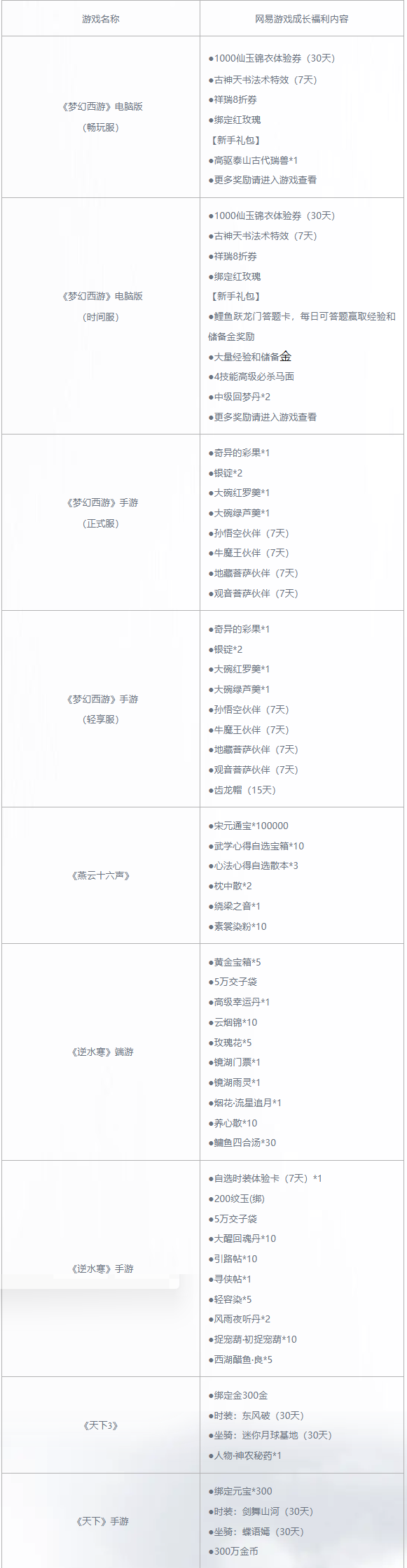 为《射雕》玩家更好的体验网易游戏,网易公司针对《射雕》玩家推出以下福利活动,玩家可在《梦幻西游》电脑版、《梦幻西游》手游、《燕云十六声》、《逆水寒》端游、《逆水寒》手游、《天下3》及《天下》手游中获得网易游戏成长福利。