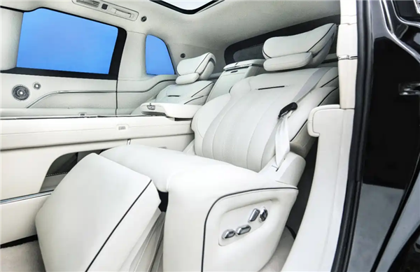 车身侧面则是无B柱对开门设计,车内采用四座尊享布局,据悉,新车车内有效空间长度3.7米,二排配备独立航空头等舱座椅,支持145度大角度调节,腿部空间可达1.2米。