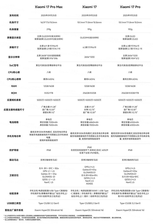 共三款新机:小米17、小米17 Pro、小米17 Pro Max,起售价分别为4499元、4999元、5999元。