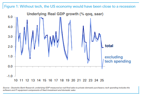 这就意味着没有AI相关资本的支出,美国经济实际上已经是处于衰退区间了。