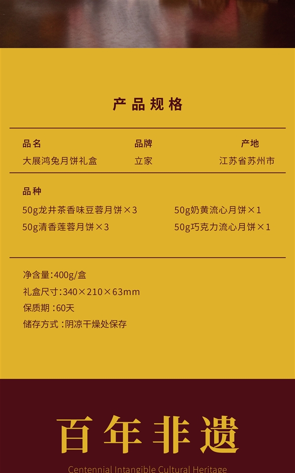 包含:奶黄流心月饼50g×1、巧克力流心月饼50g×1、清香莲蓉月饼50g×3、龙井茶香味豆蓉月饼50g×3。