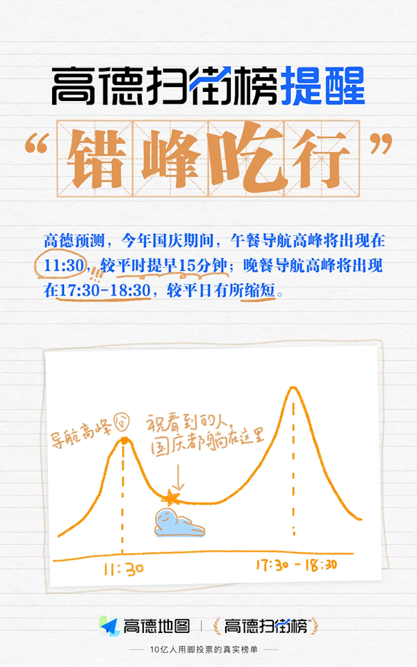 为避开“人从众”,高德扫街榜推荐错峰策略:就餐避开高峰时段,选择榜单上的烟火小店而非网红扎堆处;景区游览错开上下午峰值。