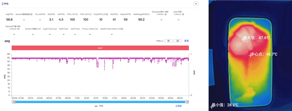 来到压力更大的 《 崩铁 》 匹诺康尼黄金的时刻跑图中, iPhone 17 Pro 的发挥依然稳健,平均帧率 58.8 帧,平均功率 4.7W ,而且机身温度依然非常可控,最高温度 47.6 度,微微烫手。