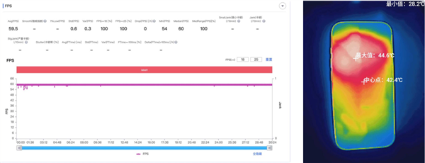 首先在相对低负载的 30 分钟 《 原神 》 须弥城跑图中,iPhone 17 Pro 的帧率表现非常稳,由 Perfdog 记录平均帧率 59.5 帧,平均功率 4.8W ,最高温度出现在正面,44.6 度,只能算微微热。