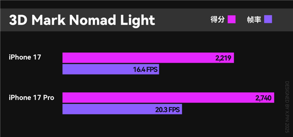 到了验证 GPU 性能的 3D Mark Nomad Light 环节,还是因为核心数量的差别,所以 A19 的分数要比 A19 Pro 落后 19% ,到这差距就开始有些大了。