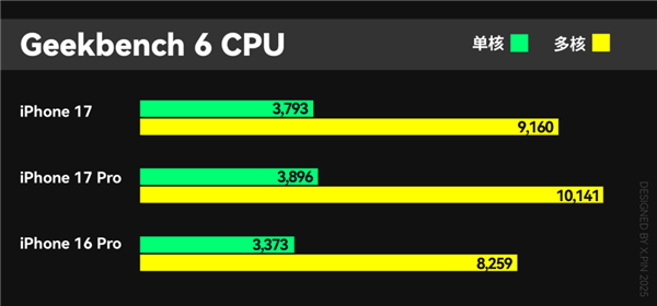 今年 A19 与 A19 Pro 的刀法逻辑跟去年 A18 一样,都是砍在 GPU 上,iPhone 17 Pro 上的 A19 Pro 拥有 6 个 GPU 核心,而标准版的 A19 与 iPhone Air 上的 A19 Pro 则砍到了 5 个。