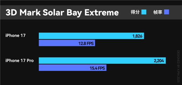 同样有明显差距的是验证光追性能的 3D Mark Solar Bay Extreme ,A19 得分 1826 ,以 17% 的差距落后于 A19 Pro 的 2204 分。