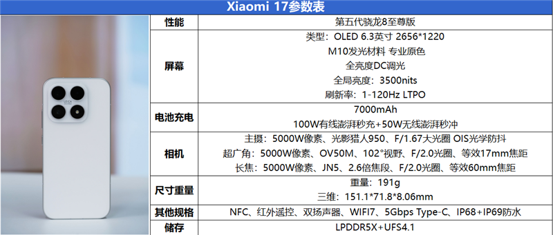 以下是小米17标准版详细参数表。