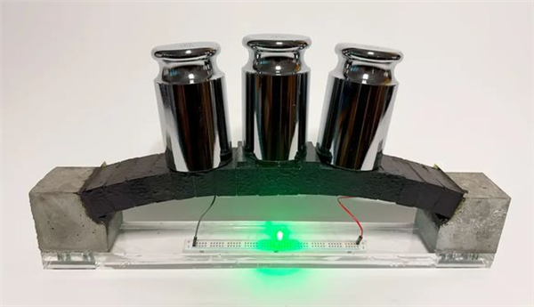 为展示实际潜力,团队建造了一座小型EC³拱门,不仅能承重,还可点亮LED灯。当结构受压时,灯光闪烁,这一现象未来或可用于建筑健康的实时监测。