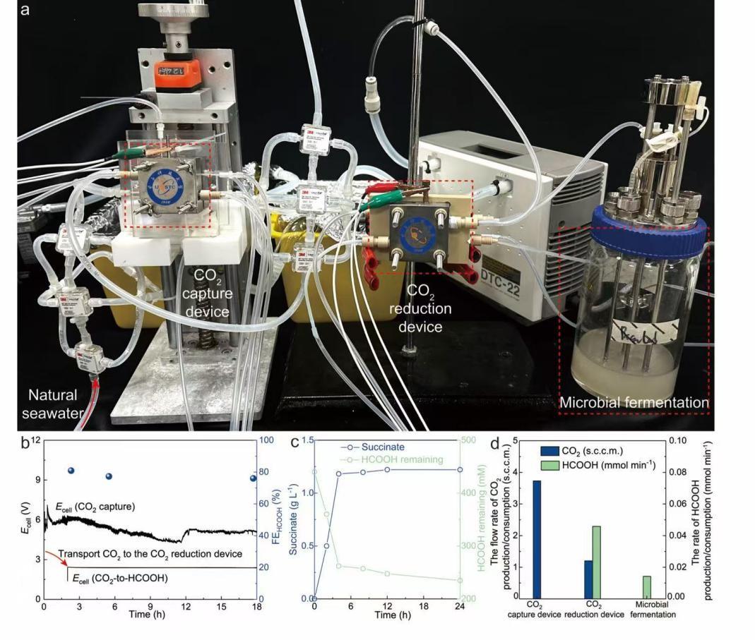 未来,研究团队计划在沿海地区构建集成化的“绿色工厂”。一方面,依托电催化装置持续从海水中捕获二氧化碳并转化为甲酸。另一方面,通过发酵罐中的工程菌将甲酸高效转化为绿色塑料原料。随着技术不断优化与大规模应用,该研究将有效缓解海水酸化问题,构建“捕碳-产料-制品”一体化绿色产业链,真正实现“边捕碳、边产料”的可持续生产模式,为我国“蓝色经济”高质量发展注入强劲绿色动能。