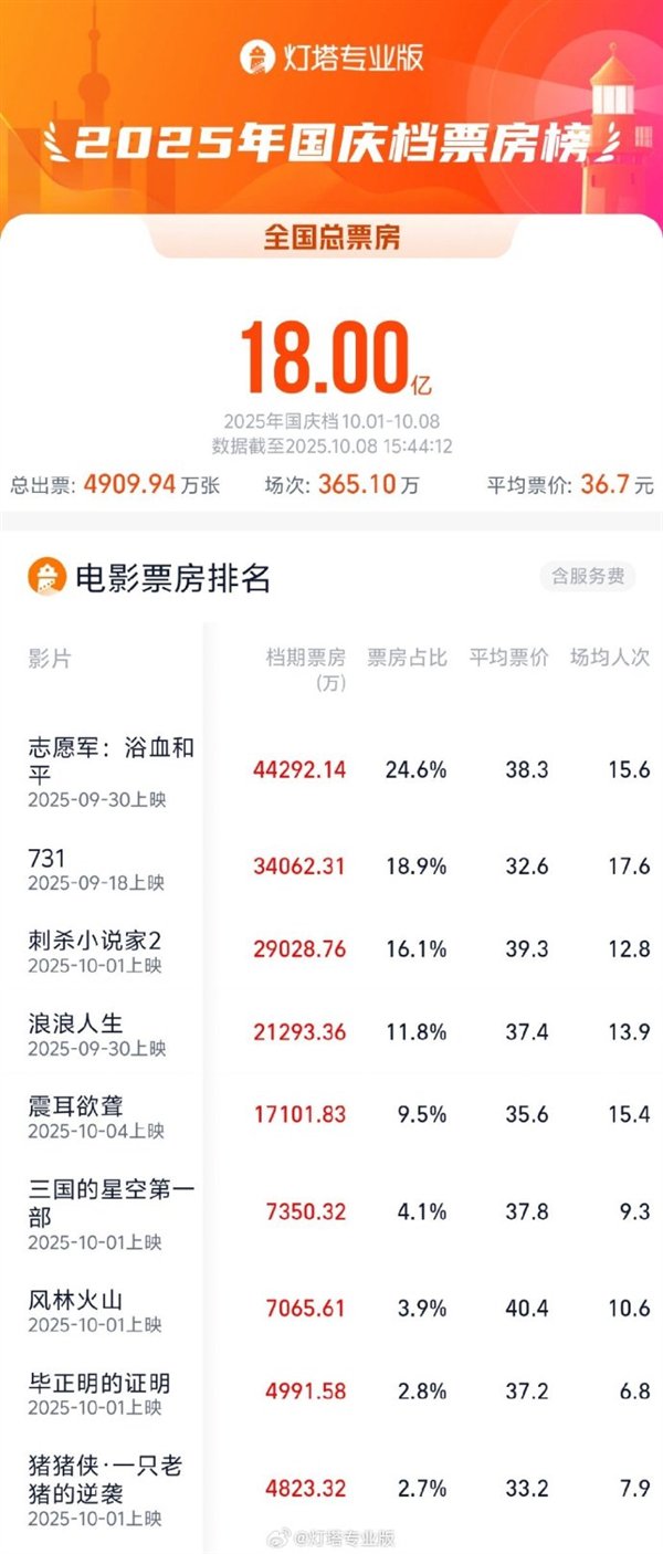 快科技10月9日消息,据灯塔专业版数据显示,截至昨日15时44分,2025年国庆档(10月1日—10月8日)档期总票房突破18亿。