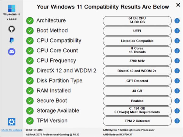 最新的2.0版本还大改了UI界面,可以清晰地看到你的电脑环境能不能达到Win11的要求,如下所示: