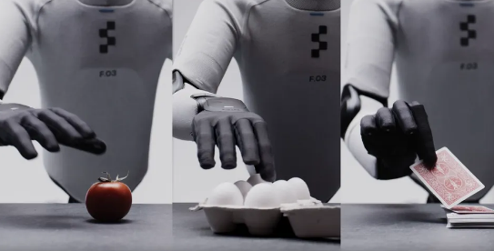 新手部结构是本次升级的重点。Figure 03的手指更柔软、顺应性更强,接触面积更大,能够稳定抓握不同形状与大小的物体。每个指尖可感知仅3克(约一枚回形针重量)的微小压力,从而区分“稳定持握”与“即将滑落”的状态,实现更精细的操作控制。演示中,机器人可分别拾起番茄、鸡蛋和一张扑克牌,并实现轻柔放置,展现了优异的手部灵活性。